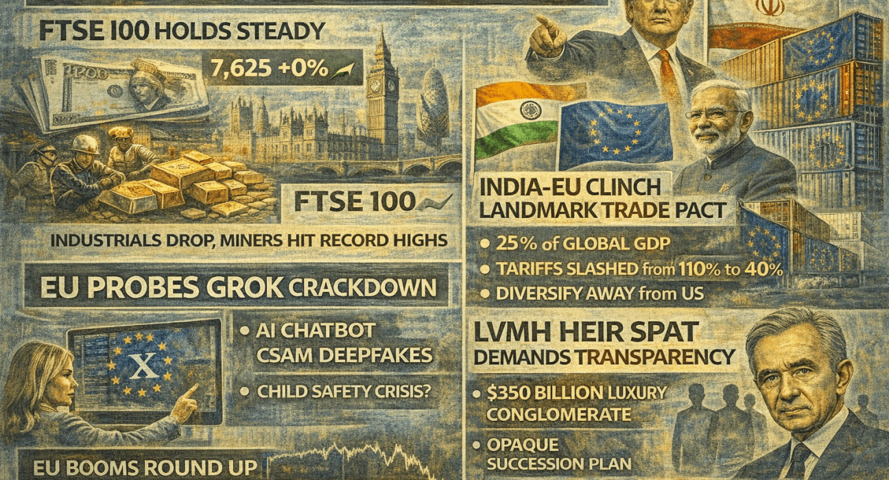 Europe opened the week in a wary holding pattern, with the FTSE 100 flat as industrial and travel names slid on fresh tariff threats and Iran sanctions, even as metal miners rallied to record highs. Trade geopolitics stayed front and centre after India and the EU sealed a long-awaited free trade pact to counter protectionist